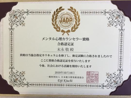 今回、メンタル心理カウンセラーの資格を取得することができました。